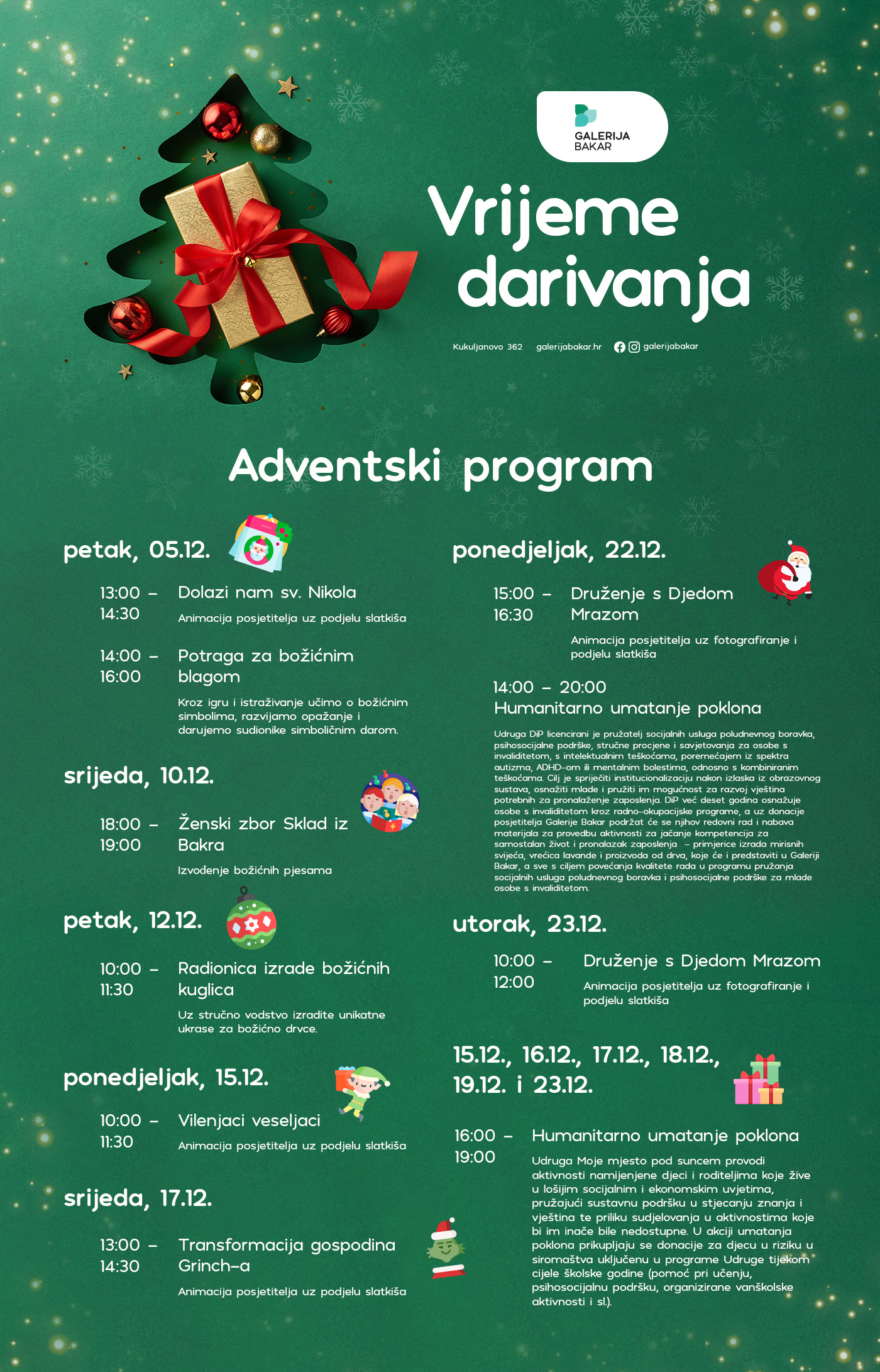 Blagdansko veselje u Galeriji Bakar započinje 5. prosinca kada u 13 sati dolazi sveti Nikola, a nakon njega od 14 do 16 sati slijedi potraga za božićnim blagom – događanja koja potiču obitelji na zajedničko sudjelovanje i stvaranje uspomena. Dana 10. prosinca od 18 sati Ženski zbor Sklad iz Bakra unosi glazbenu čaroliju u centar, dok 12. prosinca od 10 sati radionica izrade božićnih kuglica omogućuje kreativno izražavanje i ugodno druženje.